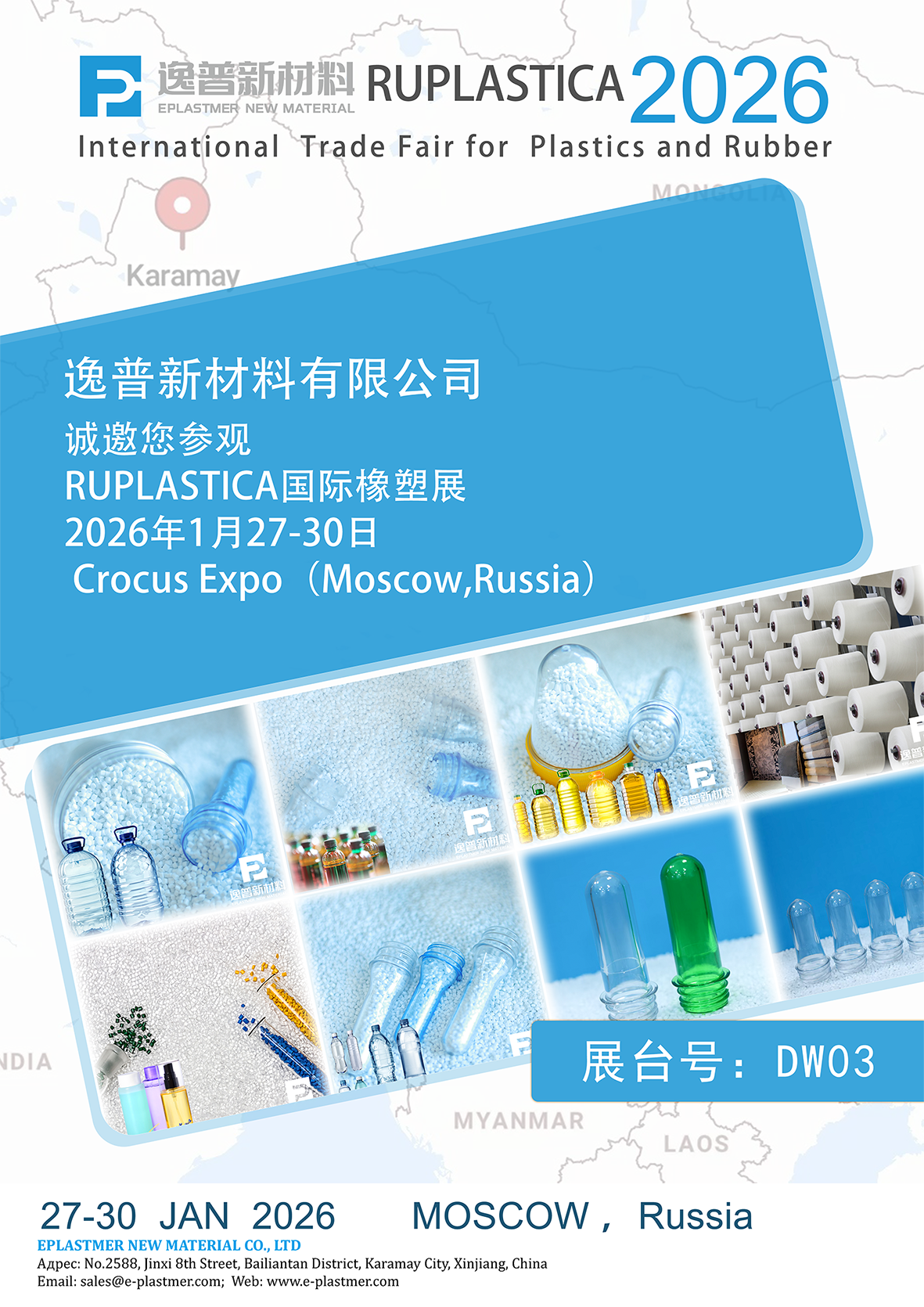 地点:俄罗斯莫斯科 Crocus Expo逸普新材料将于2026年1月27日至30日,将在莫斯科Crocus Expo RUPLASTICA 橡塑展与您相见。
